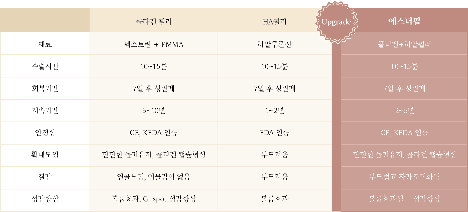 비수술적인 방법으로 질 내에 콜라겐 캡슐을 만들어 주는 시술로서 질벽이 얇아지는 것을 막아주며, 신생 콜라겐으로 질벽을 두껍게 유지해 줍니다. 콜라겐 캡슐이 만들어지기 때문에 중력이나 마사지 등에 의해 이동하지 않으면서 원하는 부위에서 풍부한 부피 효과가 장기간 안정적으로 유지됩니다.