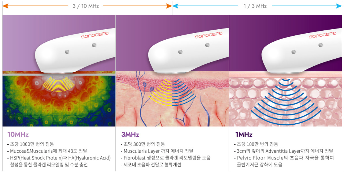 (소노케어의 1,3MHz, 10MHz의 각 주파수는 질 이완증, 질 건조증 및 질염 개선에 도움을 줍니다.)